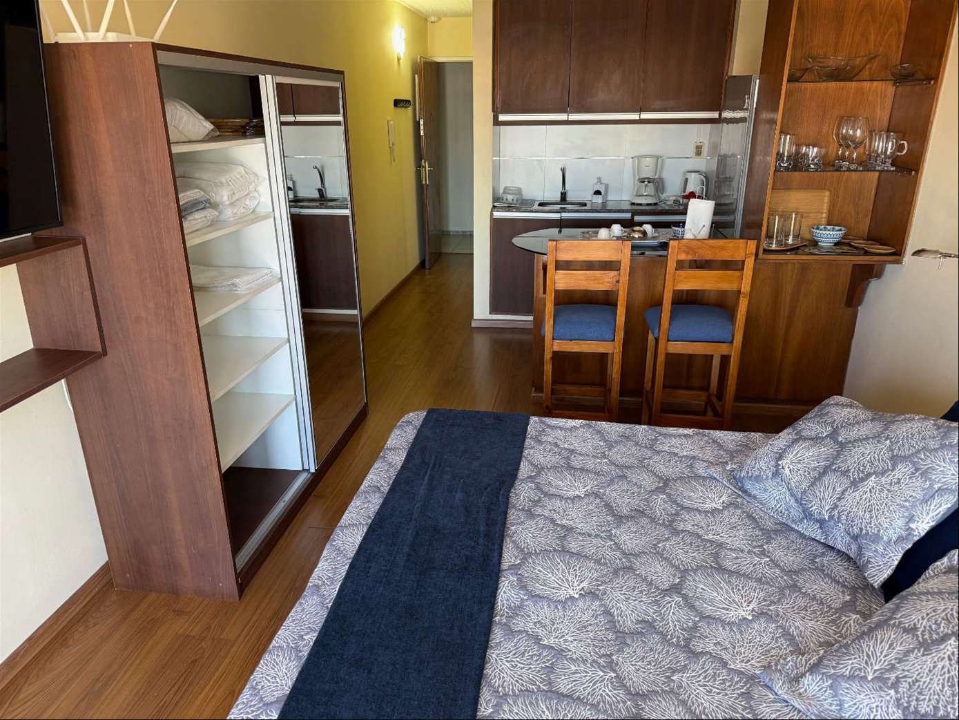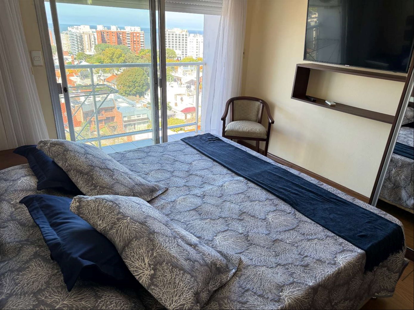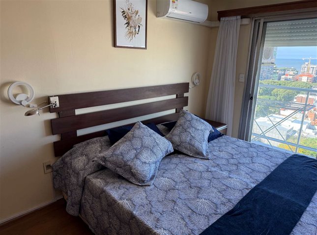 Alquiler de muy lindo monoambiente con terraza, totalmente equipado a pasos del WTC y Rambla. Piso alto con terraza y unas vistas preciosas despejadas al mar y Puerto del Buceo. Ambiente con cama king (dos sommiers individuales juntos), placard con ropa blanca, aire acondicionado, televisión, kitchenette separada por un mueble con barra tipo mesa y sillas, separando ambos ambientes. Placares en cocina sobre y bajo mesada, calefón, heladera con freezer, microondas, tostadora, jarra eléctrica, cafetera, cocina totalmente equipada. Baño completo con mampara, placard y lavarropas. Persiana automatizada. Muy luminoso. Edificio con vigilancia 24 horas y dos ascensores. Barbacoa común con parrillero en último piso. Ubicación privilegiada, a pasos del WTC, Montevideo Shopping y Rambla, rodeado de servicios y con locomoción en la puerta para cualquier parte de la ciudad. Costo del wifi $ 1.900 mensuales.